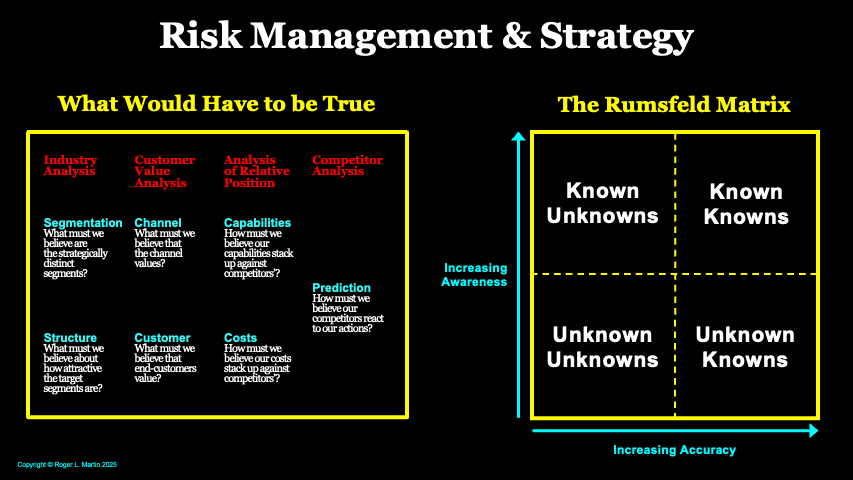 Risk management has become a big deal for boards — arguably an obsession. They spend a disproportionate amount of time on it — and not very productively. I think there is a more constructive way for boards (and their management teams) to deal with risk, which I discuss in this Playing to Win/Practitioner Insights piece entitled Risk Management & Strategy: The Centrality of What Would Have to be True.
